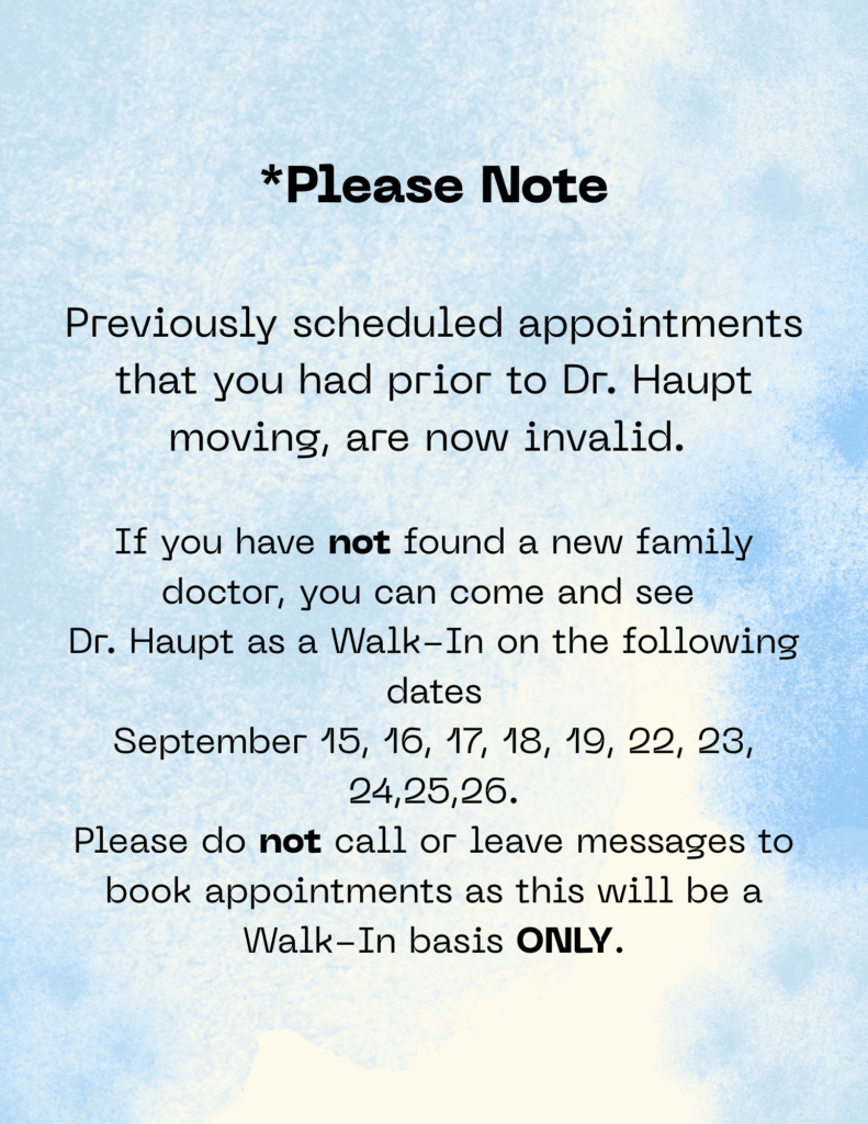 Dr. Haupt will no longer be providing walk-in services on Fridays until further notice.…
